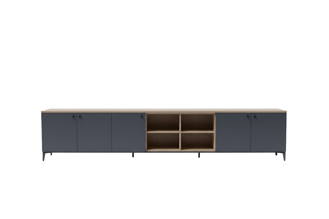The collection features a sleek main desk with a side return, a long low storage cabinet,