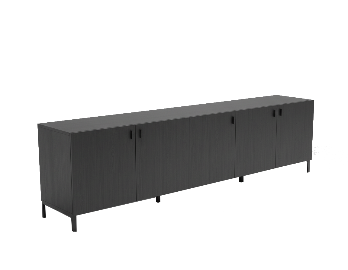 A modern executive desk set made of high-quality MDF with a durable melamine finish. The collection features a sleek main desk with a side return, a long low storage cabinet, and a tall glass-door display unit with LED lighting. |